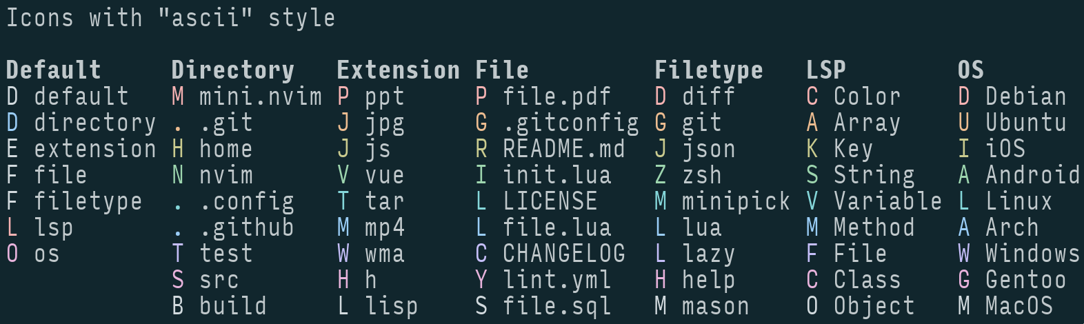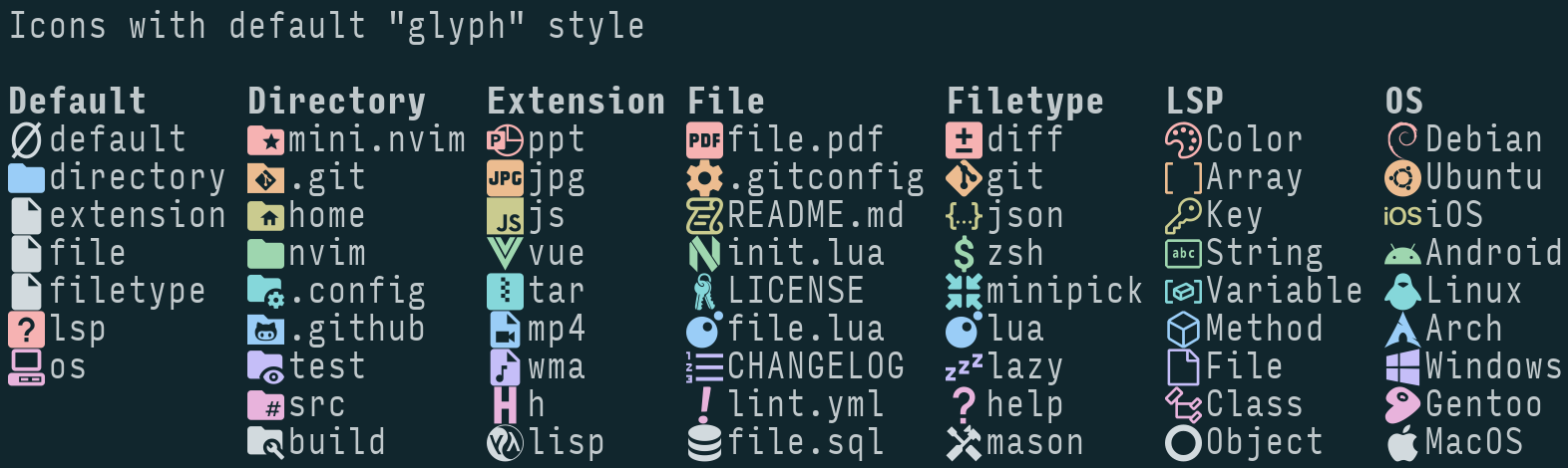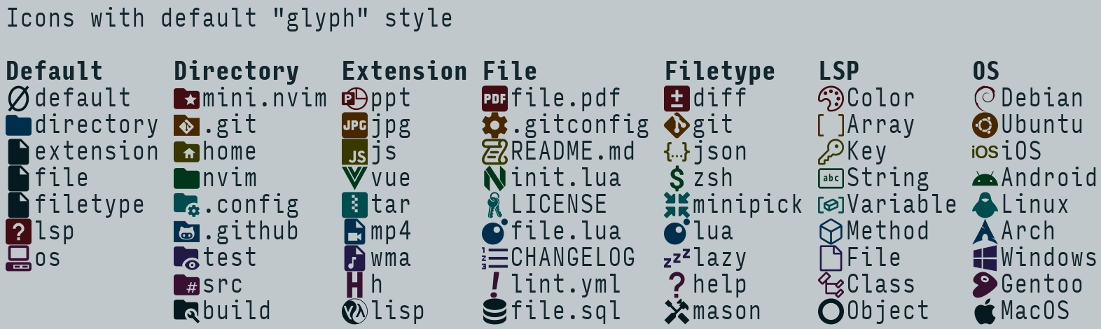 MiniIcons.get()for various categories: filetype, file/directory path, extension, operating system, LSP kind values. Icons and category defaults can be overridden. -