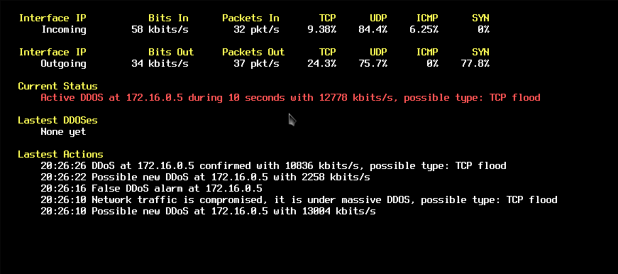 With a ncurses interface you can monitor network traffic live and watch recent events. Logs are saved to log folder, any ddos attack detection send an email to the user.