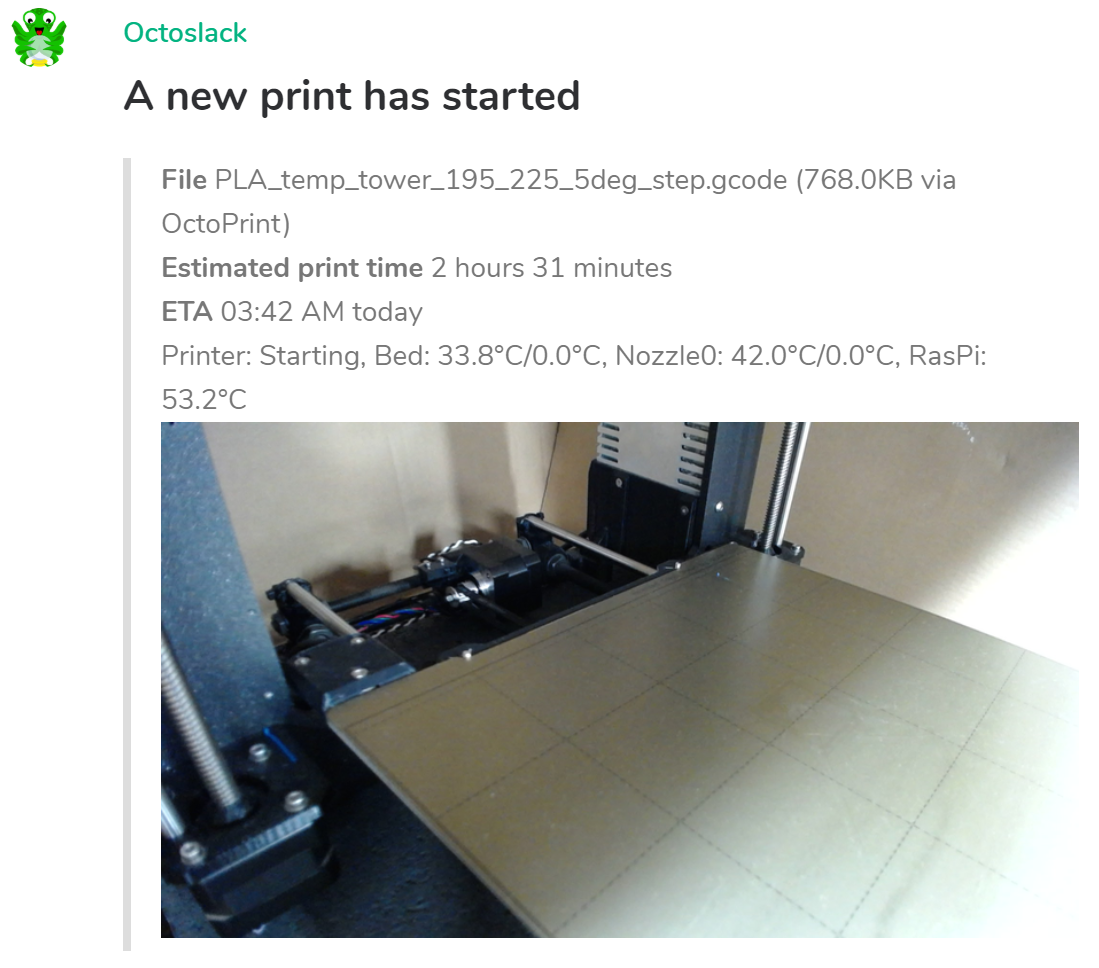 • Respond to Slack commands to check print status or cancel/pause/resume a print