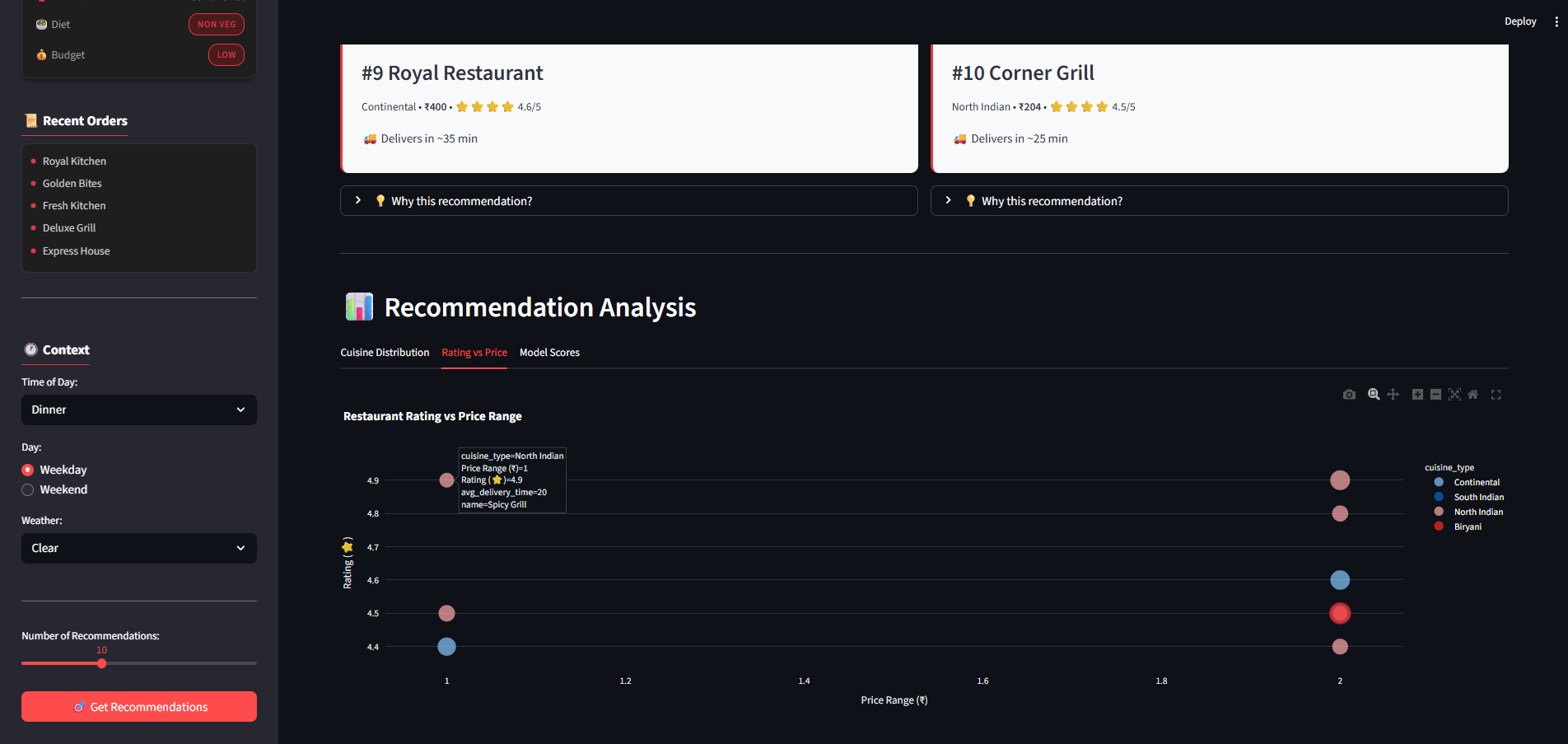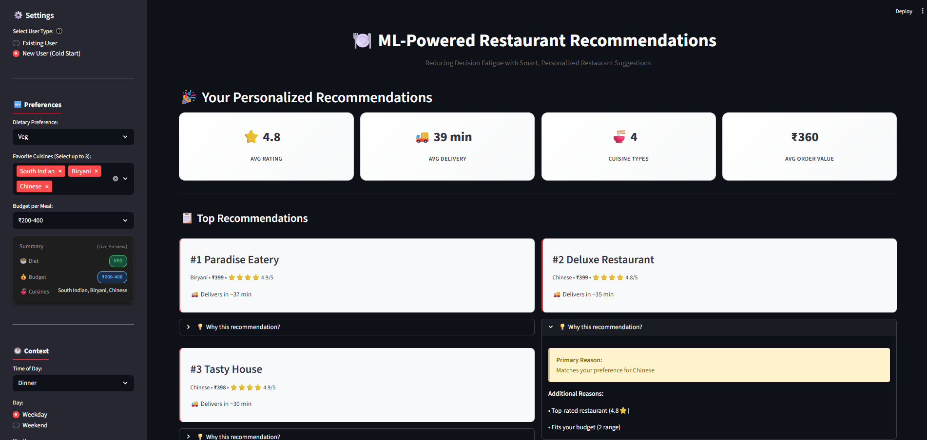 "I deliberately chose simpler models over deep learning. Why? Because food needs trust. Users won't order from a 'black box' recommendation. Every suggestion has a clear reason: 'You've ordered South Indian 3 times, rated 4.5/5 by 856 customers.' That's worth more than 2% accuracy."