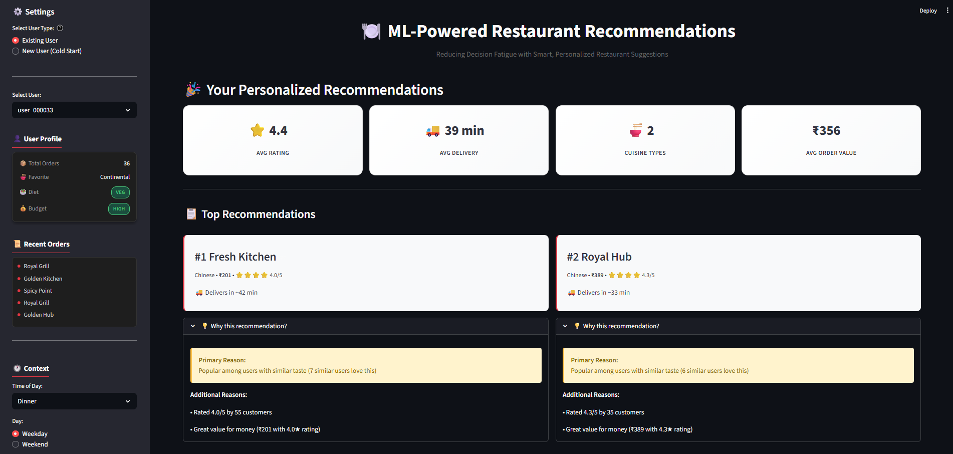 Why: Food recommendations require trust. Users won't order from a restaurant they don't understand why it was suggested. Explainability isn't optionalโ€”it's core to adoption.