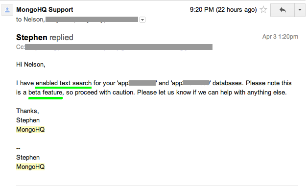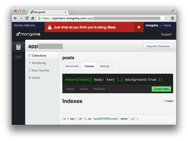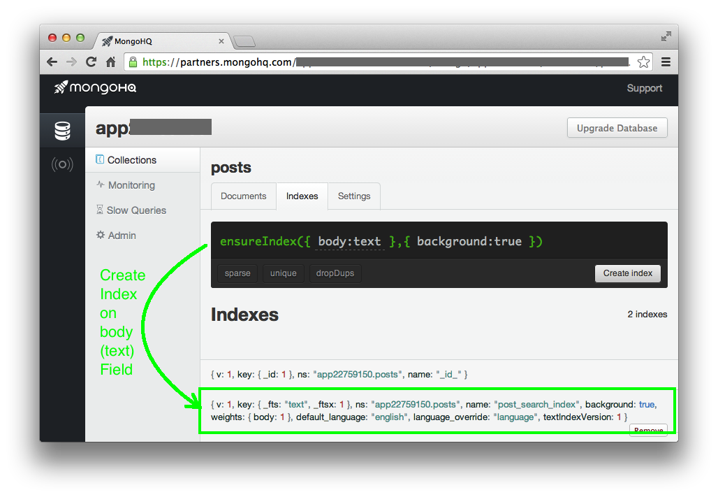 Thankfully this is quite easy with MongoDB's ensureIndex method. In our case we are simply going to index the post's body field: