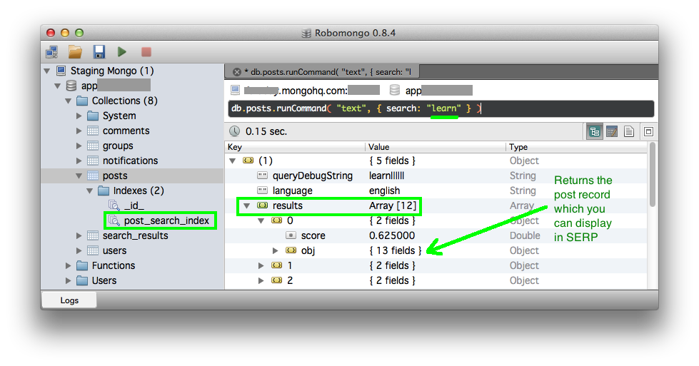 Once you have some content you need to ensure that MongoDB is indexing it.