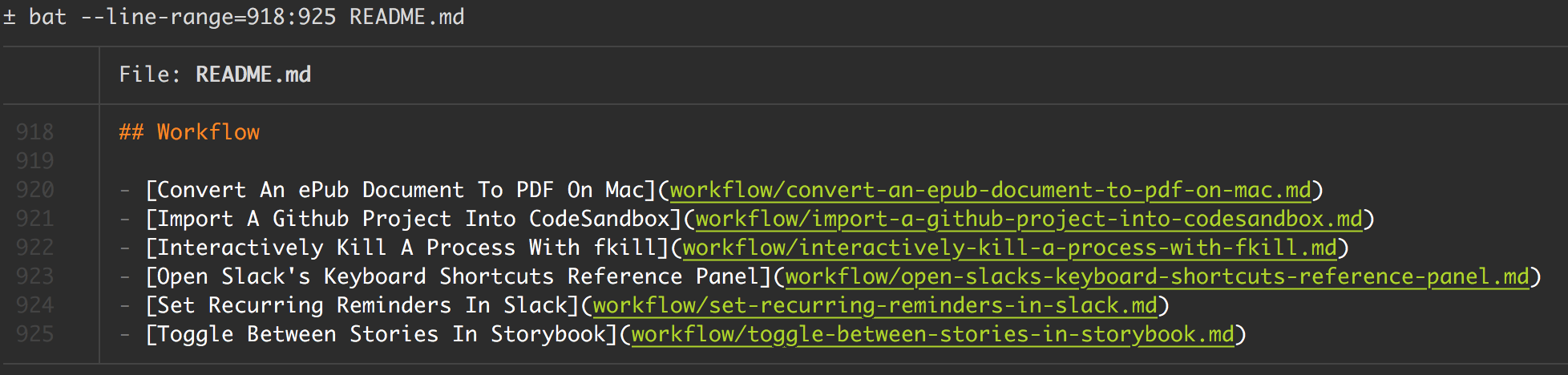 $ bat --line-range=918:925 README.mdwill produce the following output