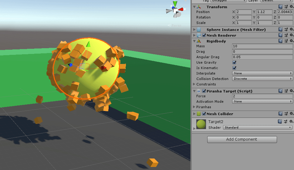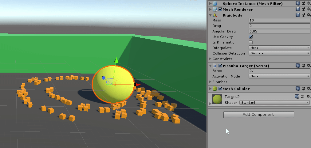 PiranhaTargetcomponent to a game object with a Mesh Filter or Skinned Mesh Renderer. - Drag any rigidbodies you want to swarm the target into the