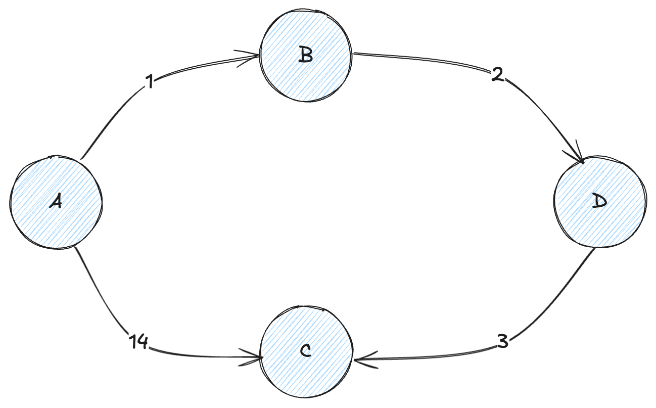 위의 그래프에서 A부터 C까지의 최단거리를 BFS를 통해 구한다면 14의 비용을 가지게 된다. 그러나 실제로는 A->B->D->C의 경로를 통해 이동해 6의 비용을 가지는 경로가 최단거리이다.