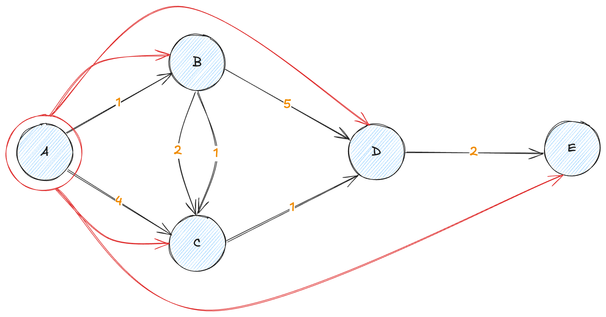 정점 A가 시작점일 때, 모든 정점으로의 최단거리를 구하는 알고리즘이다.