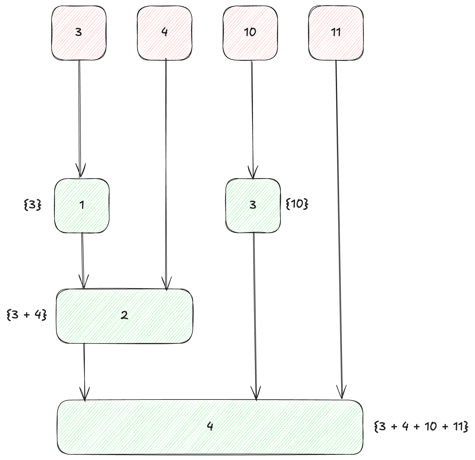 팬윅트리는 {3, 4, 10, 11}이라는 배열이 주어졌을 때, 위의 그림의 초록색 노드를 만들어 구간합을 구한다.