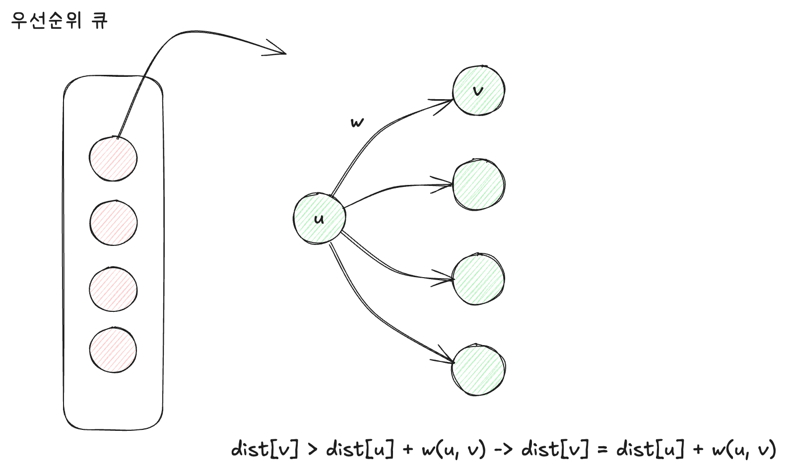 dist[]배열을 갱신한다. 이때, 정점 u에서 정점 v까지 거리와 비교하여 더 짧아진 경우dist[u] + w(u, v) = dist[v]로 갱신하는데, 이를 완화가 일어났다고 한다. - 갱신된 최단거리와 정점의 정보를 다시 우선순위 큐에 넣고 1번을 반복한다.