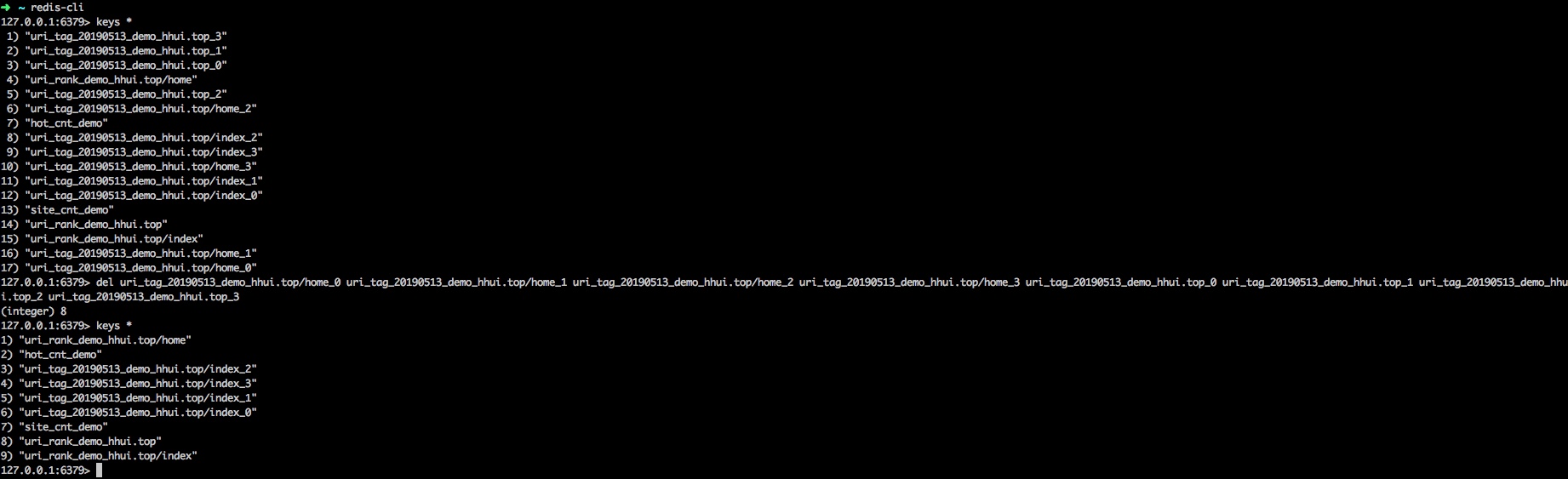 http://localhost:8080/visit?app=demo&ip=192.168.0.2&uri=http://hhui.top/home真要第二天操作有点麻烦,为了验证,直接干掉今天的占位标记