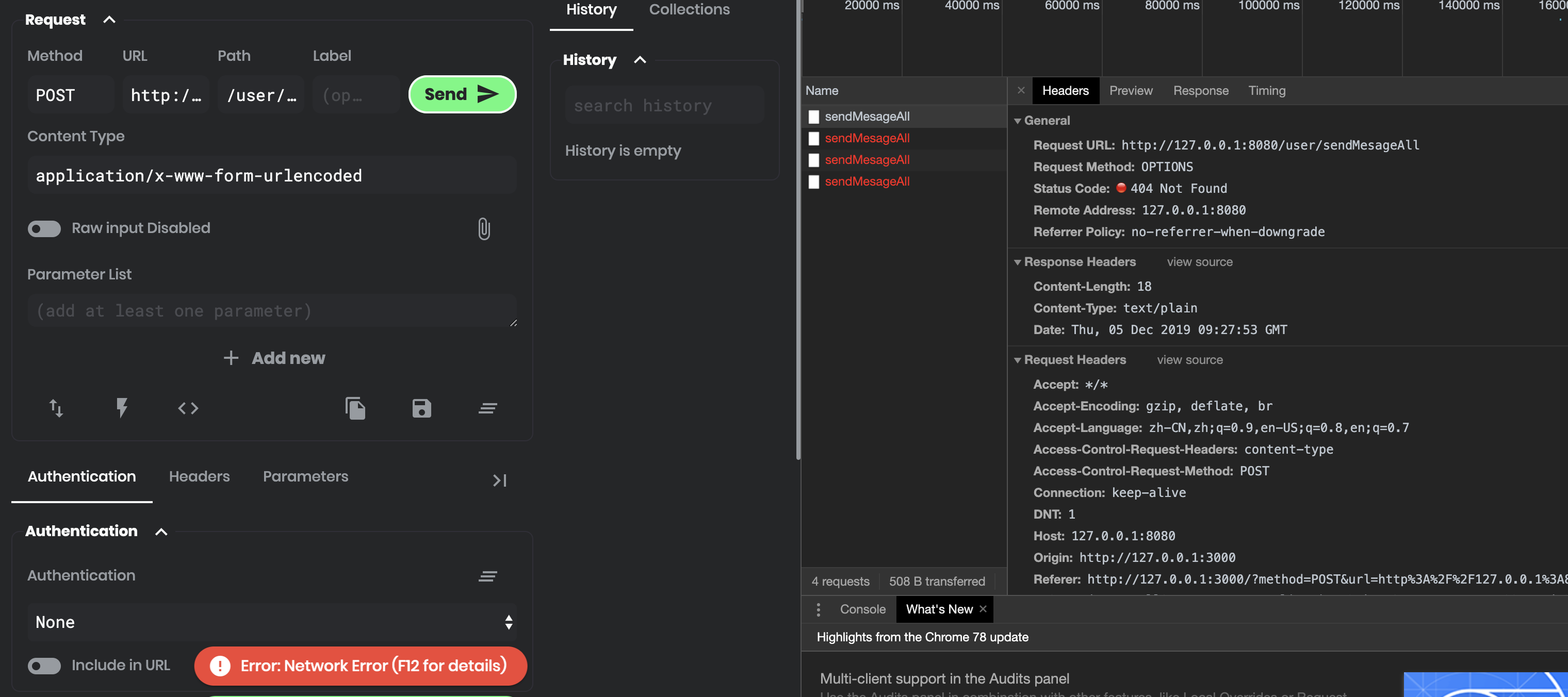 **Describe the bug** Post Mode can't send request. Error: Network Error. Check console for details.  **Additional context** I start go server listen localhost:8080