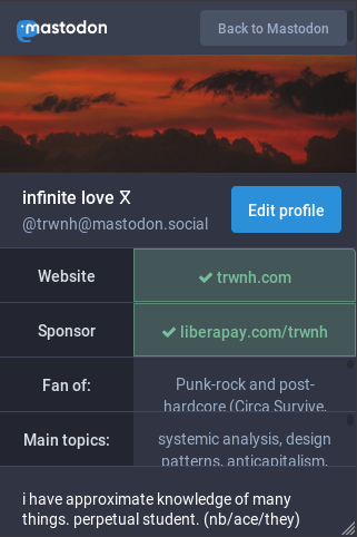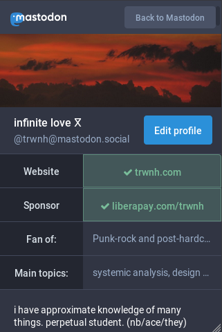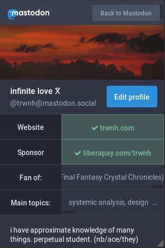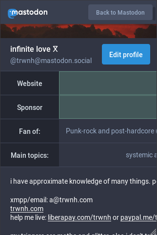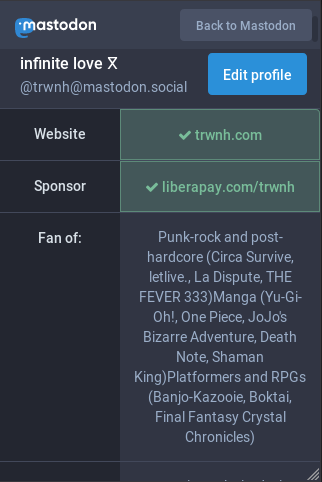 account__header__fields {max-width: 100vw}.account__header__fields dd, .account__header__fields dt {white-space: nowrap}overflow: autoto allow scrolling when necessary, or disablemax-height: 48pxto allow full text to be displayedI can submit a PR for whichever solution is deemed most acceptable. I personally prefer "Wrap with no max-height", but if the extra height is undesirable for whatever reason, then "maxwidth with overflow:auto" would be my second choice.