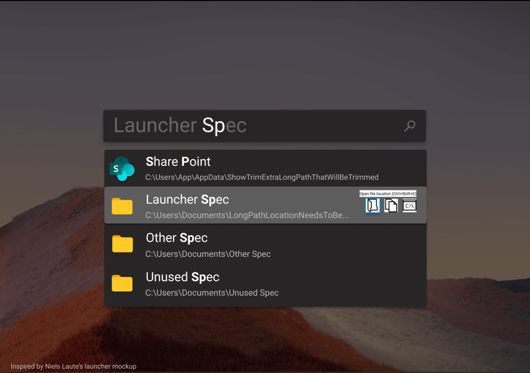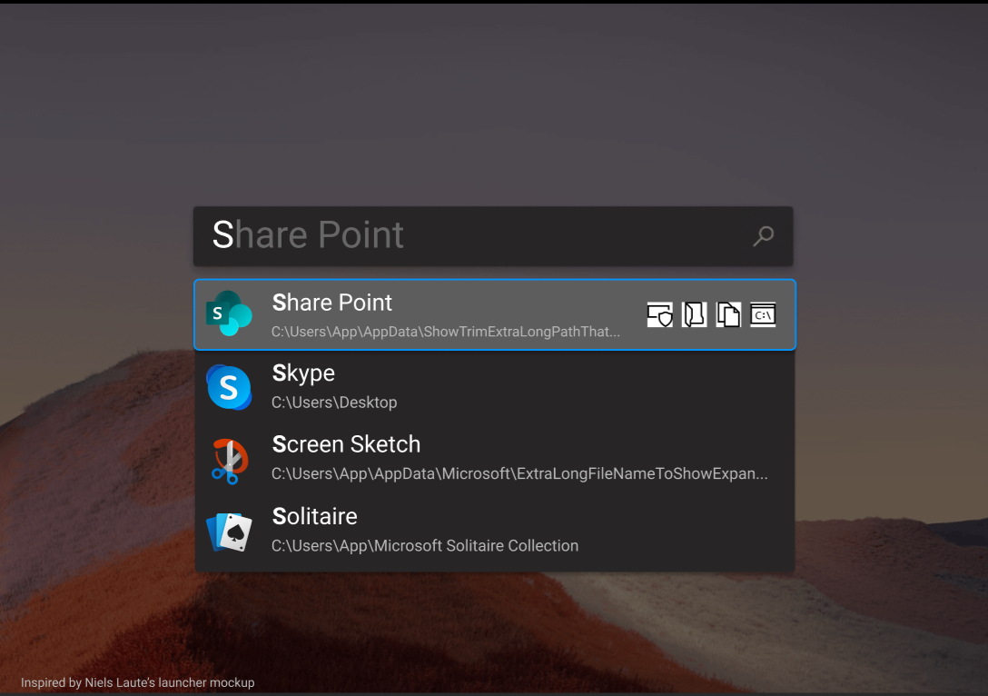 Currently, power users can launch an application using Windows launcher by running Win+R shortcut or searching the desired application in Windows Search (Win+S, Windows menu + start typing). Power users can also search for results through Windows Search by typing in the search bar directly or by specifying a category (apps, documents, email, web, folders, music, people, photos, settings, and videos). Several third-party tools also exist to extend the capability of Windows’ launcher.