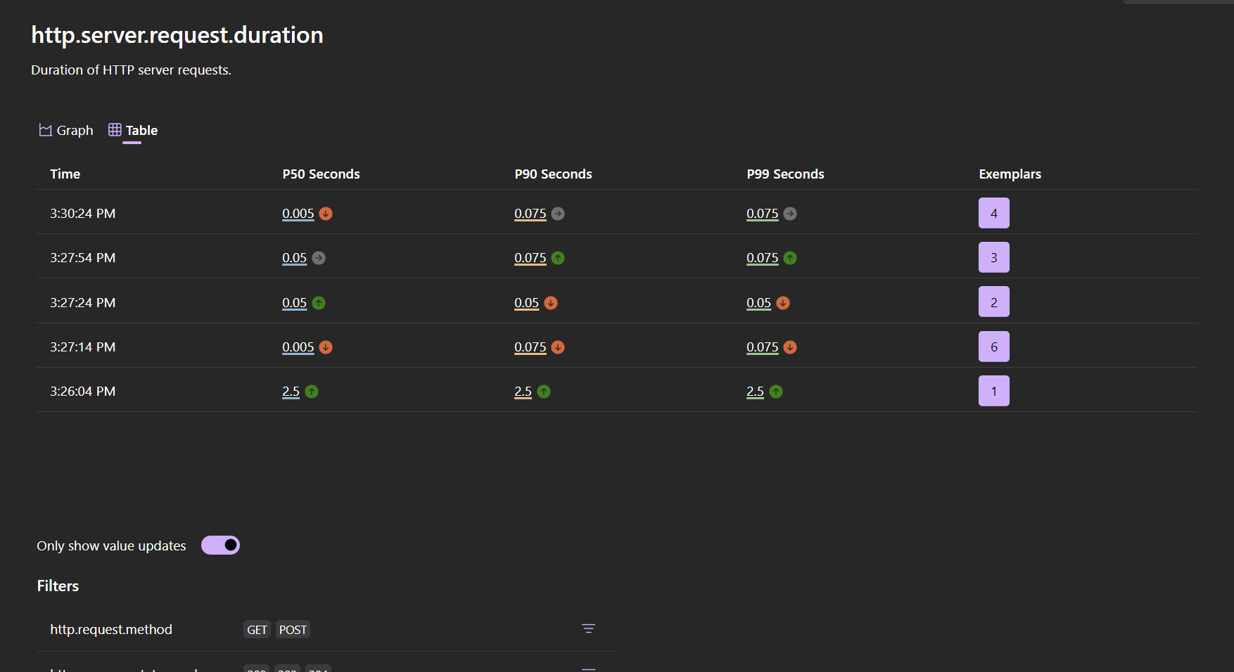 I think the table is very nice 👍 Is there anything that will prevent the graph from becoming cluttered with many exemplars if the app is running under sustained load? It seemed like if P50 stayed low but not zero it might get obscured behind lots of exemplar dots all concentrated near the x-axis. |
