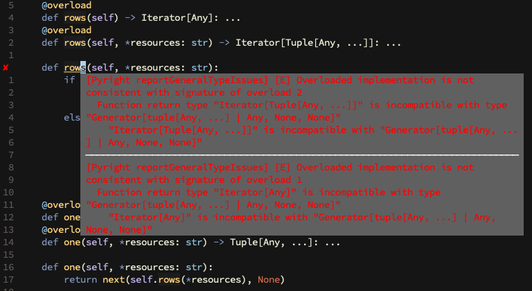 If you have the ability to change the interface to this function (e.g. refactor it into two calls), that's what I'd recommend. This sort of polymorphism will not work well with static typing. If you're stuck with the existing interface definition, then this is probably the best approach: @overload