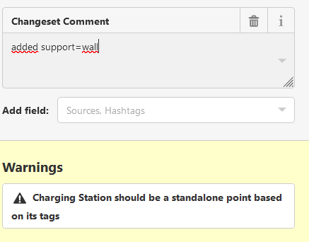 a support=wall charning station is part of a wall but the validator warn that it should be a not-connected node