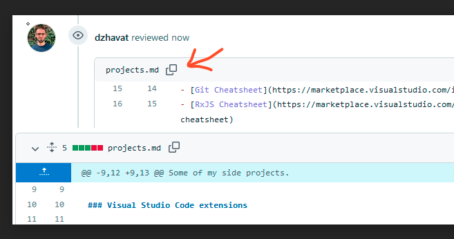 I'd like a copy filename button button on the code review panes file name header in the PR discussion screen so I can easily copy the file to get to it in my editor.