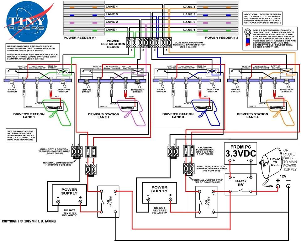 Check the arduino-code folder for the source. You will also need to use the UnoJoy project so that the Arduino appears as USB HID-compliant device. The Ultimate Racer RMS software can only interface in a limited number of ways. We didn't want to use parallel port or serial port methods as they proved problematic in the past and usually required antiquated hardware. The Arduino will appear as a PS3 stlye gamepad to the computer to send race events to Ultimate Racer. Getting events out of Ultimate Racer is a bit challenging because few interfaces are supported. To get around this problem, the Arduino controls the open/closed state of the relay circuit and only sends signals into Ultimate Racer to pause the heat if a car gets deslotted. The Arduino is connected to a 5v relay (shown as 3.3 in diagram -- either is fine and supported by the Arduino). The 5v relay then triggers 2 12v relays to control power to the lanes.