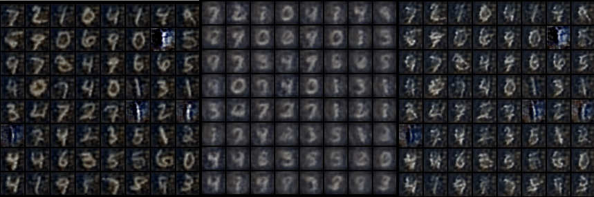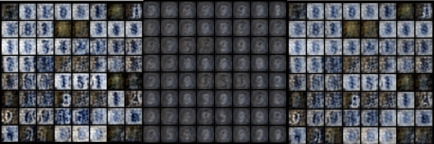 The accuracy on mnist test dataset can achieve 76.62%. The reconstructed images from left to right: reconstructed by private and shared feature; reconstructed by shared feature; reconstructed by private feature.