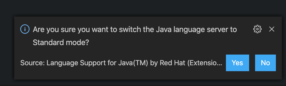 Detects if java ls started in lightweight mode and prompts user to switch to standard. The user ends up getting a second prompt from vscode-java to ask if they are sure.
