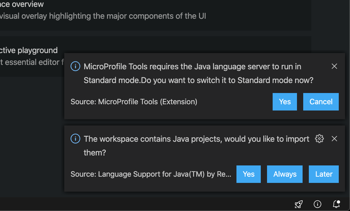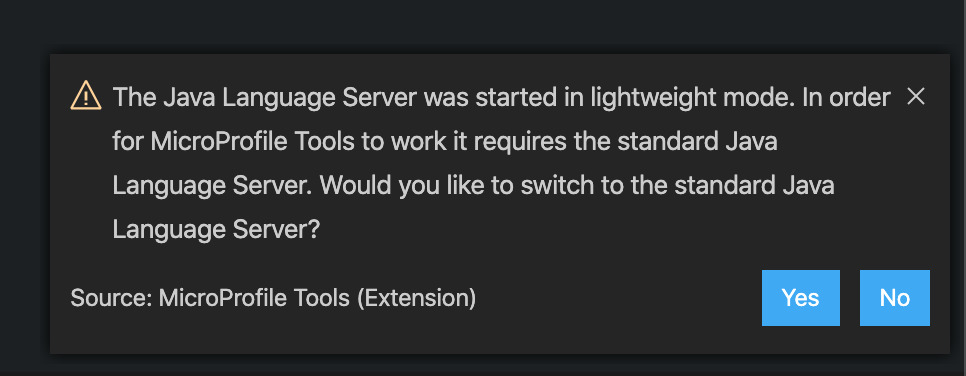 This is pretty helpful for switching to the full Java language server from the lightweight mode. Before the user responds to the dialog box, NPEs will be generated, since the client program doesn't wait for the user to respond before starting lsp4mp. If 'no' is selected in the first dialog, then the microprofile server is left running, which means NPE are still generated.