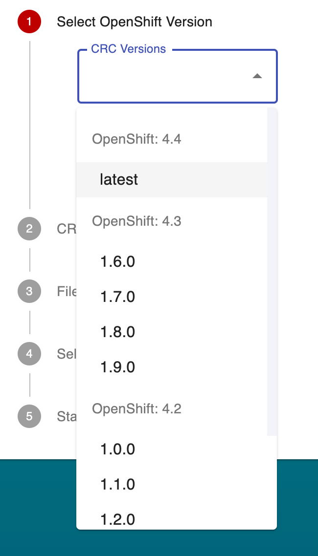 crc, the select dropdown should list them the versions grouped by the OpenShift version. By default, it will select the latest version.Based on the selected version of