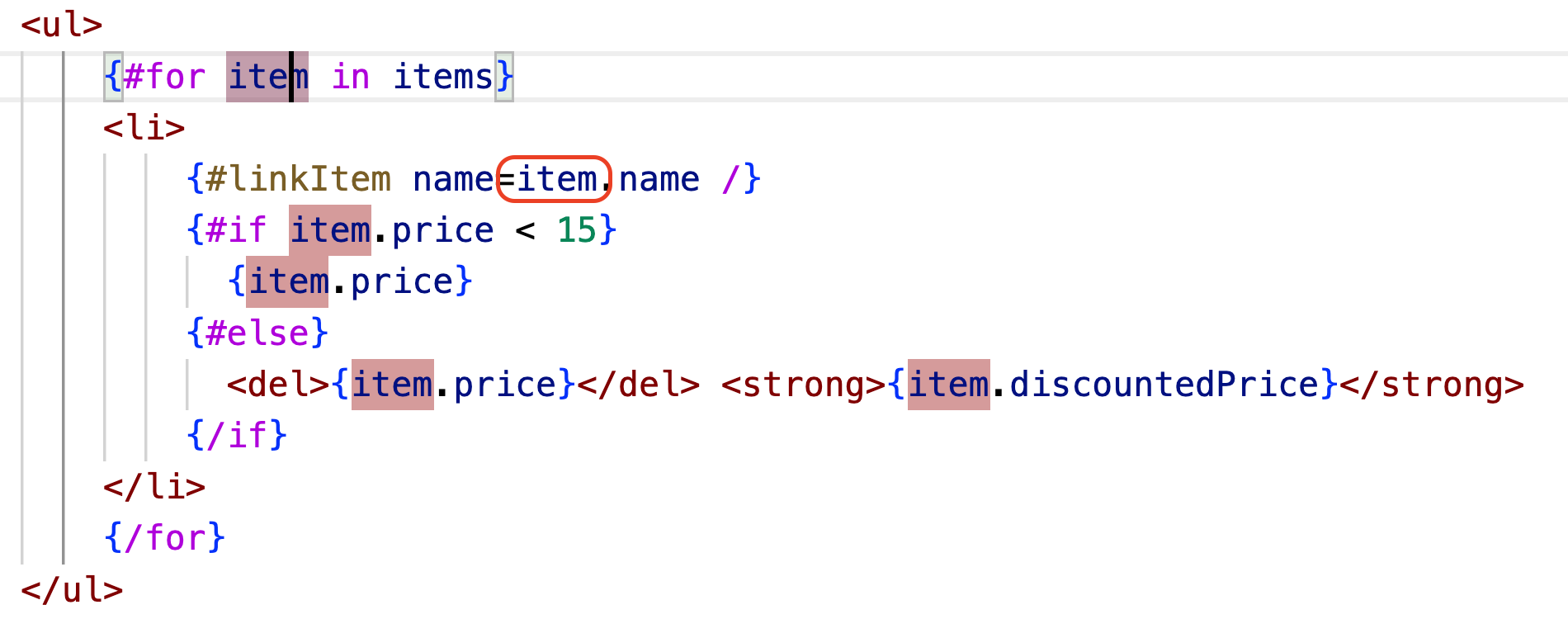 {#for item in items} <li> {#linkItem name=item.name /} {#if item.price < 15} {item.price} {#else} <del>{item.price}</del> <strong>{item.discountedPrice}</strong> {/if} </li> {/for}