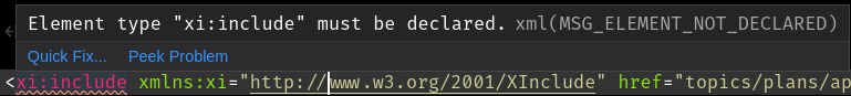 <xi:include xmlns:xi="http://www.w3.org/2001/XInclude">, thexi:includeelement is defined in theXInclude.xsdbut is not recogniced:Optionally, it would be great that the plugin took into account the include directive and parsed and the included document.