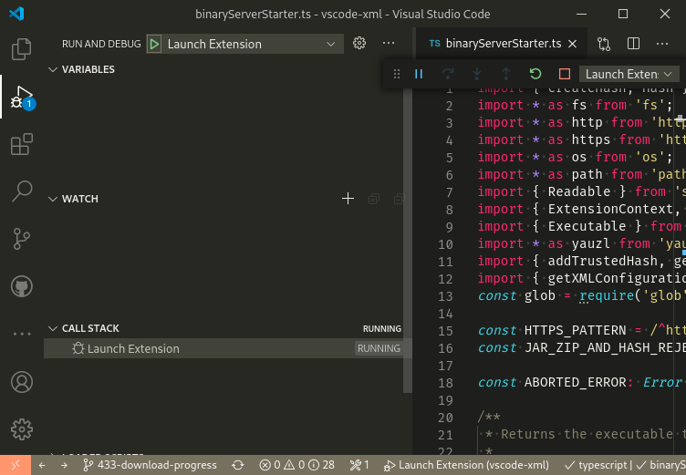 Running the extension through the debug in VS Code, you can see that there is still some process running after the Extension development window closes:
