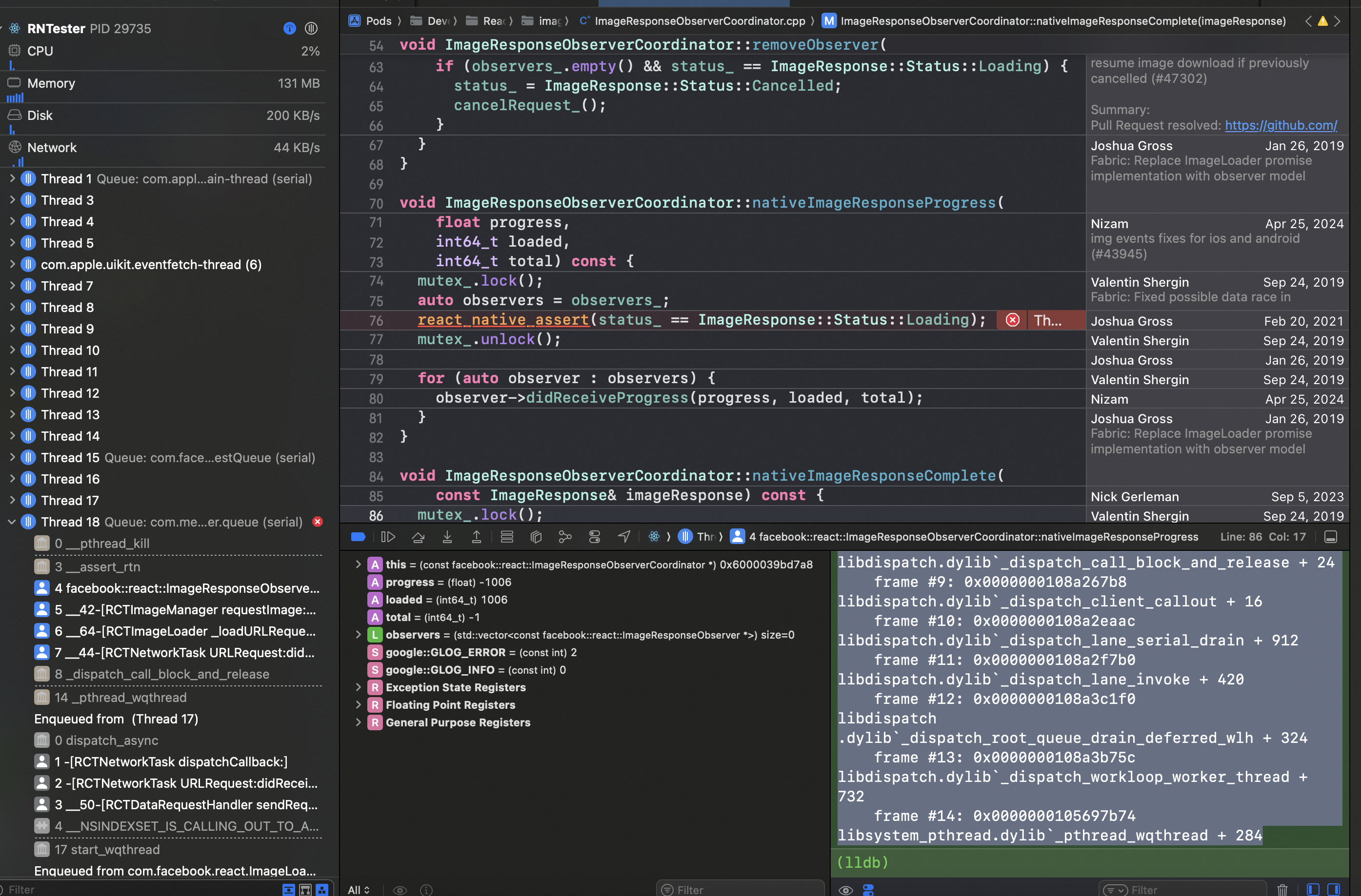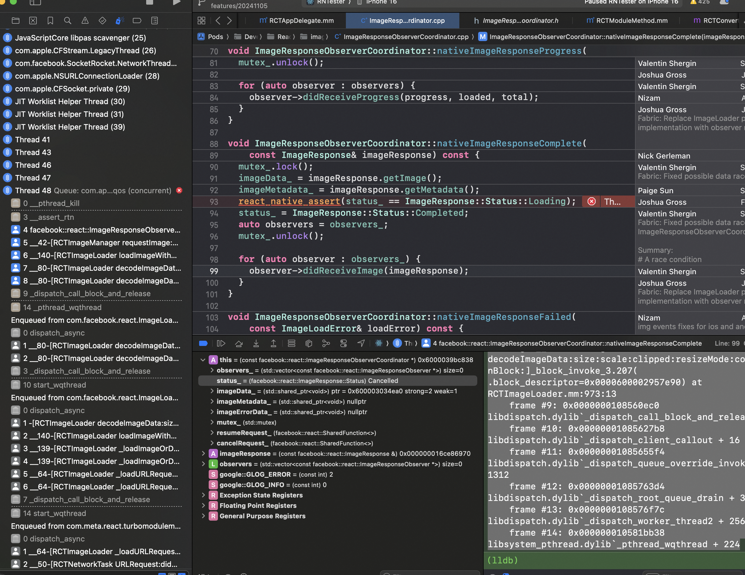 * frame facebook#4: 0x00000001073fcd64 React_Fabric`facebook::react::ImageResponseObserverCoordinator::nativeImageResponseComplete(this=0x00006000039bc838, imageResponse=0x000000016ce86970) const at ImageResponseObserverCoordinator.cpp:93:3