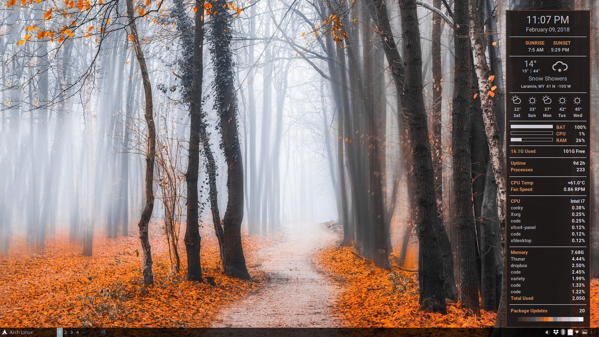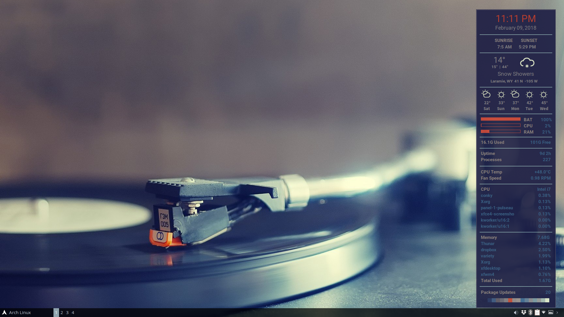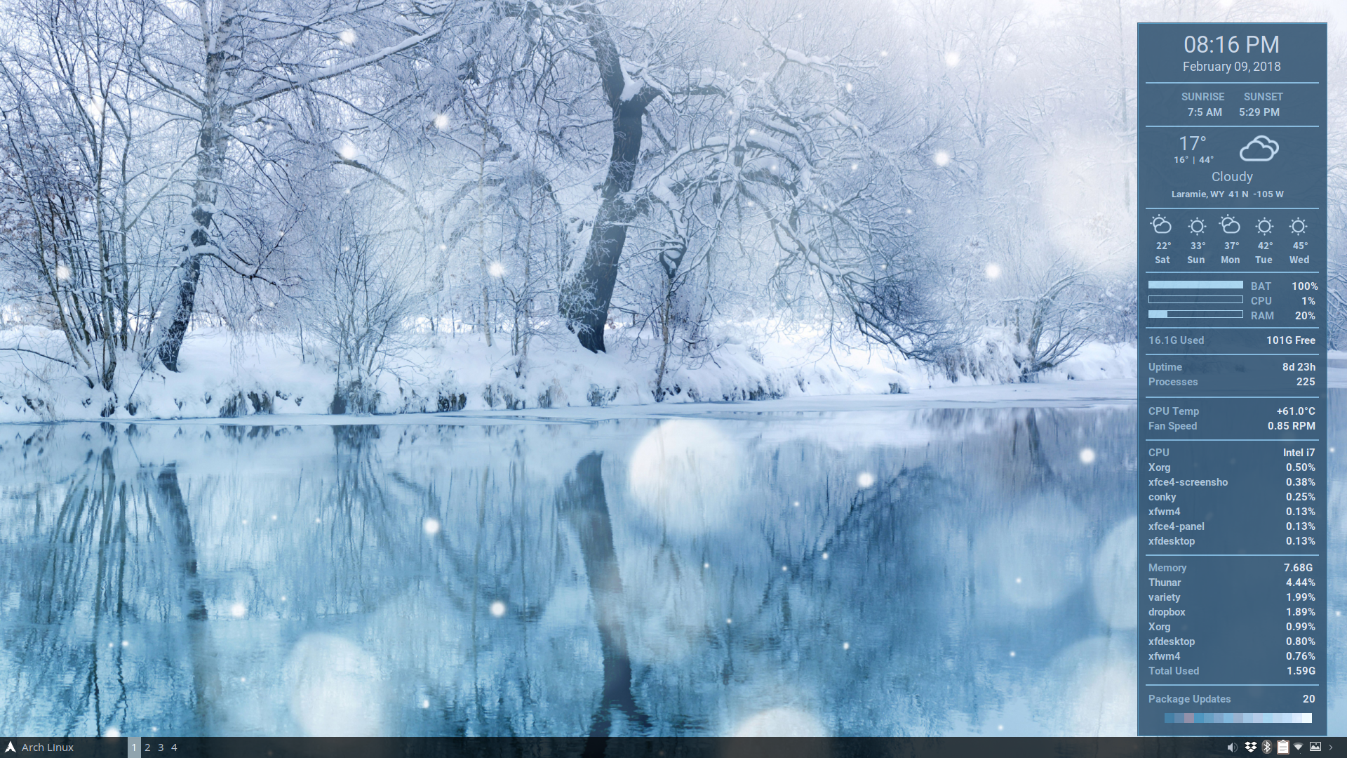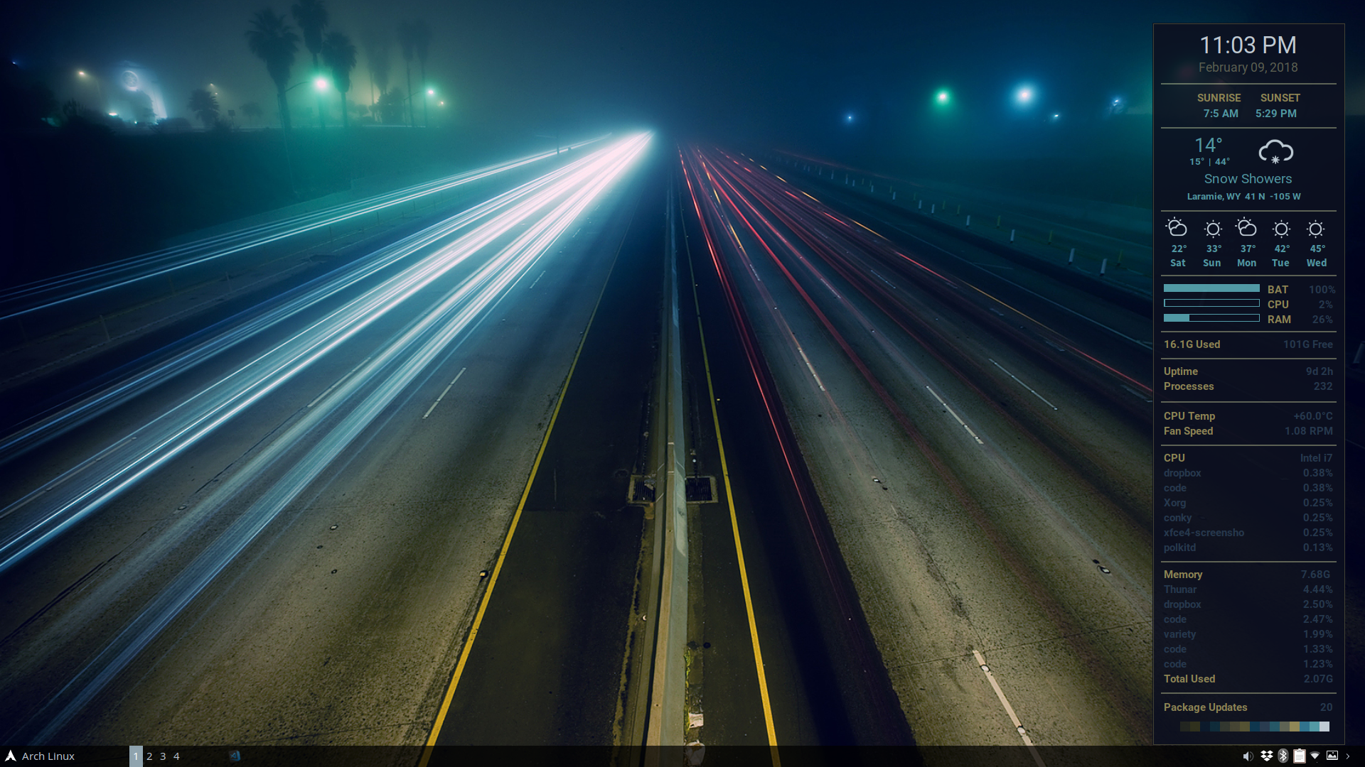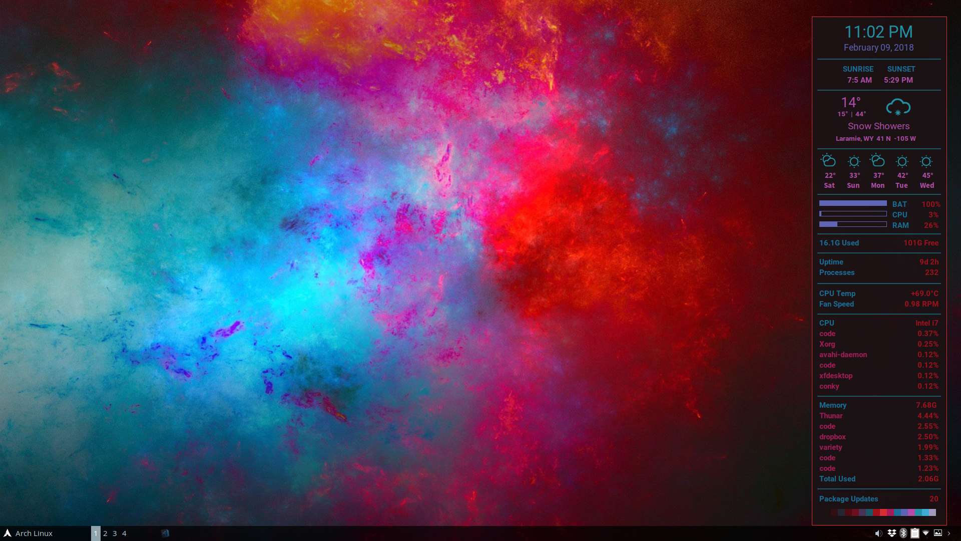 The entire sequence takes the script about 10 seconds, making it very fast and easy to build a fresh conky every time you change your wallpaper. And since the colors are randomly selected (with some logic), running the script multiple times with the same wallpaper will yield different results.