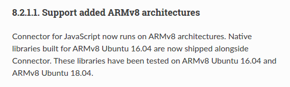 * Mention node.js support in getting_started.rst * Feature/con 173 node12 test (#14) * CON-173: Creating temporary remote branch for testing * CON-173: Update dependencies to RTI-managed repos * CON-173: Revert changes to connector * CON-177: Added support for sample/view/instance state (#15) * CON-177: Added support for sample/view/instance state * CON-177: PR feedback - Indicate possible values of the new fields in the docs - Use the naming conventions for strings in unit tests * CON-173: Fixed unit tests which were failing Some items had been added to a JSON object but not in the other JSON object we were checking. This ocurred when adding support for CON-177 * CON-173: Update docs so that we don't mention node 8 (#17) * CON-173: Update docs so that we don't mention node 8 * CON-173: PR feedback #time 5m Remove paragraph mentioning Node 12 incompatibility. Co-authored-by: Sam Raeburn <sam@rti.com> * Feature/con 188 (#18) * CON-188: Added docs + tests * CON-188: Revert changes to package.json * CON-188: Change of functionality Previously, any non-key fields would be returned as null when obtain via DD_GET operations. This is no longer the case. * CON-188: Remove debug * CON-188: PR feedback - doc related * CON-188: PR Feedback - Do not access non-key fields in the unit tests - Fix docs Co-authored-by: Sam Raeburn <sam@rti.com> * CON-209: Js doc update * Update README.md (#19) Fixing the link to OpenLayers * Feature/con 163 test (#23) * CON-163: Added test for CON-163 * CON-209: Added unit test for CON-209 Co-authored-by: Sam Raeburn <sam@rti.com> * CON-212: Added CONTRIBUTING.md file (#21) Co-authored-by: Sam Raeburn <sam@rti.com> * CON-214: Test for creating Connector with participant_qos (#24) Co-authored-by: Sam Raeburn <sam@rti.com> * CORE-10744: Updating docs for new system resource defaults (#26) Co-authored-by: Sam Raeburn <sam@rti.com> * CON-211: updating links to other manuals for connector-js * CON-211: in -js, updated GSG title and fixed an error in a GSG cross-reference * CON-188: Updated instance support section of features.rst (#29) Co-authored-by: Sam Raeburn <sam@rti.com> * Feature/con 173 napi (#27) * CON-173: Use 3rd-party managed *-napi packages * Update documentation * Fixed docs * Fix list * CON-173: Update packages used in code * CON_173: Correct struct package Co-authored-by: Sam Raeburn <sam@rti.com> * GREEN-1938: Use the ffi-napi modules in tests (#30) Some of the unit tests were requiring the ffi modules to test the ability to extend the API. Since we updated package.json to use the ffi-napi module, the ffi module is no longer present and these tests were failing. Co-authored-by: Sam Raeburn <sam@rti.com> * Updated documentation to explain that we do not support Node 12.19.0. (#31) Co-authored-by: Sam Raeburn <sam@rti.com> * Feature/con 217 (#33) * Fixed sockets.io example * feature/CON218: Added graph example * Updated example README Co-authored-by: Sam Raeburn <sam@rti.com> * PLATFORMS-1925. Updated supported platforms to match Hercules PAM. * Introduce EOL normalization (#32) * CON-174: Handle armv8 architectures (#37) Co-authored-by: Sam Raeburn <sam@rti.com> * CON-221: Added docs for the dynamic loading of libraries (#39) Co-authored-by: Sam Raeburn <sam@rti.com> * CORE-11069: Customer facing XML has been updated (#38) * CORE-11069: Customer facing XML has been updated * CORE-11069: Update XML used in tests Co-authored-by: Sam Raeburn <sam@rti.com> * Feature/con 220 (#34) * Updated package.json to not use asterisk for dependency versions * Committed the generated package-lock.json * Updated README containing additional dependencies to state specific version Co-authored-by: Sam Raeburn <sam@rti.com> * CON-211: removed a statement per reviewer feedback after resolving conflicts * CON-215: Added release notes (#25) * CON-215: Added release notes * CON-215: Added notes for CON-188 * CON-215: Added more issues to notes * CON-215: Added issue num * Update docs/release_notes.rst * Update docs/release_notes.rst * Apply suggestions from code review * Update docs/release_notes.rst * Update docs/release_notes.rst * CON-215: making same changes to Javascript docs as I made to Python ones, mainly for release notes * CON-215: PR feedback * PR feedback - Fix typo Co-authored-by: Sam Raeburn <sam@rti.com> Co-authored-by: rkorte <rkorte@rti.com> * restore 'LICENSE.pdf' to git from lfs * Removed the gitattributes file since it now has no use * GREEN-2058: Added tests for new functionality in DD parser (#41) Co-authored-by: Sam Raeburn <sam@rti.com> * Updated native libs * Feature/dir renames (#43) * Updating directory names when searching for native libs * - Update commit to submodule - Remove support for 32-bit windows + Linux * Update commit of native libs * Explicitly load library dependencies on Windows * Fix loading of extra libs Co-authored-by: Sam Raeburn <sam@rti.com> * Updated platforms * Removed symbol from ARMv7 platform * Updated submodule to feature/update-libs-for-internal-rel (#45) Co-authored-by: Sam Raeburn <sam@rti.com> * Feature/release notes fix (#46) * - Fixed formatting of release notes - Updated version in docs * - Added static method to Connector class providing current version. * fix typo * - Set version to 1.1.0 in docs - Remove version() functions - needs further thought on implementation - Updated docs to use RTI blue colour Co-authored-by: Sam Raeburn <sam@rti.com> * Update README in web socket example (#48) * Update README in web socket example * Fix formatting Co-authored-by: Sam Raeburn <sam@rti.com> * Added Ubuntu 16.04 to release notes (x64, Armv8) (#47) * Added Ubuntu 16.04 to release notes (x64, Armv8) * Added ARMv8 support to whats new 1.1.0 * fix typo Co-authored-by: Sam Raeburn <sam@rti.com> * Update minimum supported version of node v10 in docs (#49) Co-authored-by: Sam Raeburn <sam@rti.com> * CON-211: testing all links to core docs, fixing few that were broken - js * CON-215: added two new js release notes * CON-194: js changes: upd