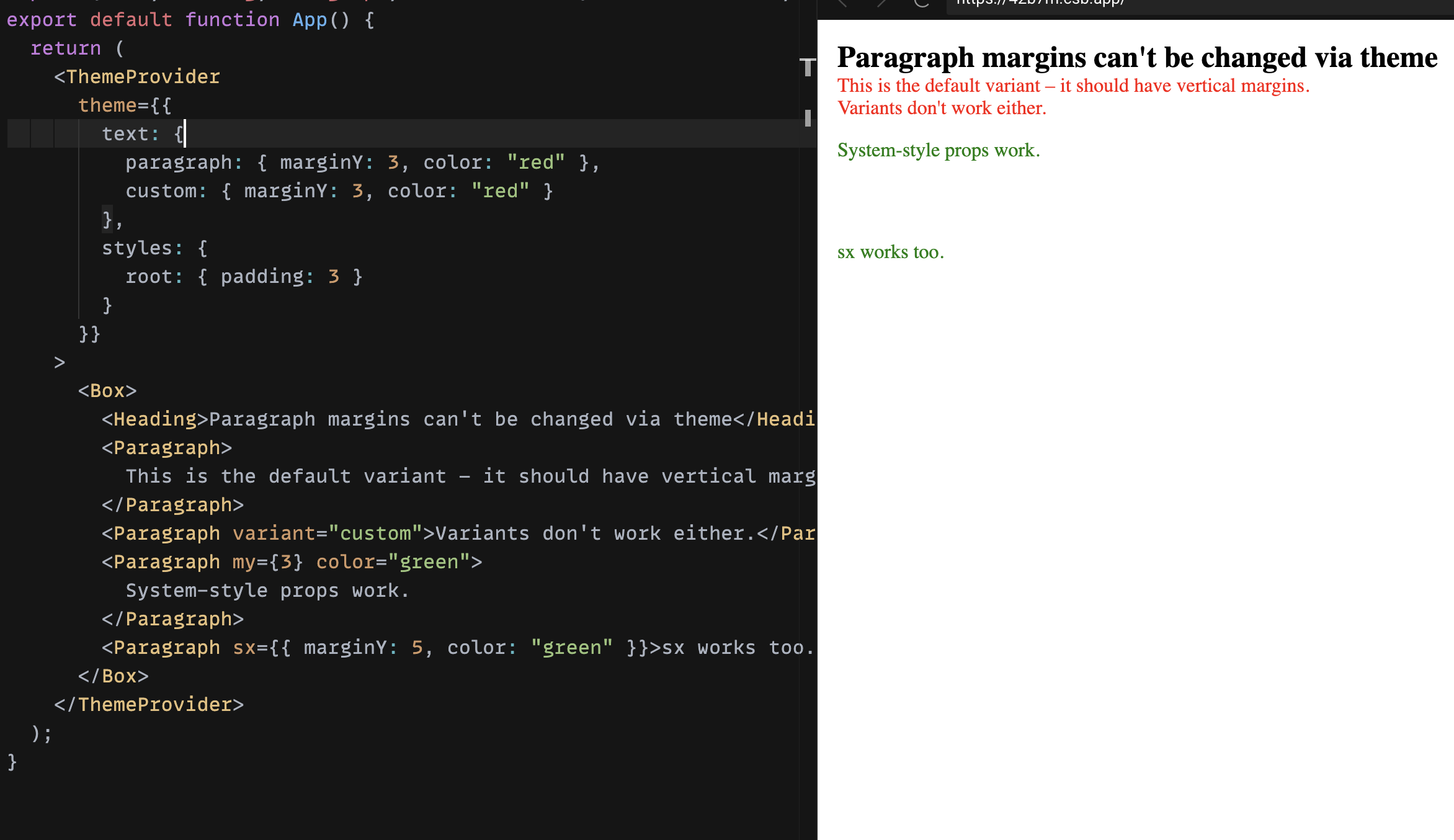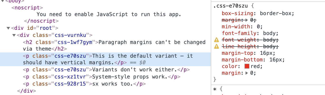 Paragraph margins can't be changed via theming because the m={0} value is always added after applying the theme. This was first fixed in #1476, but reintroduced by #1560.