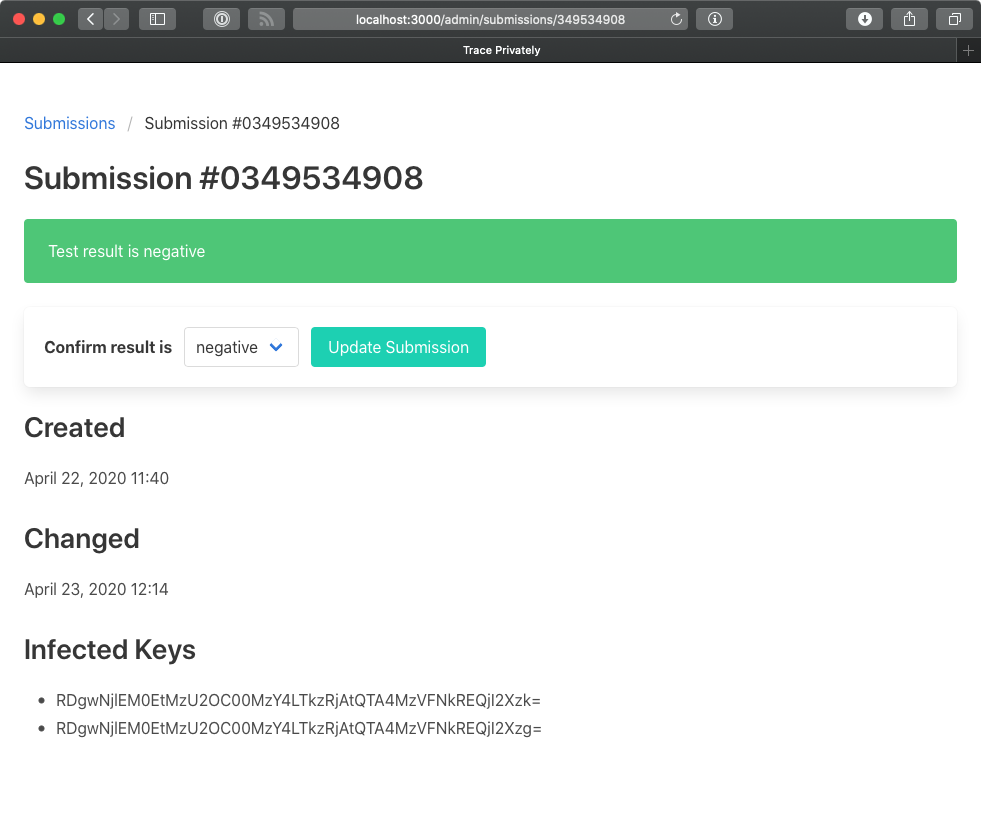 Government agents or helth professionals can view recent submissions and confirm test results.