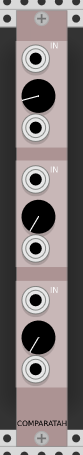 Comparatah compares the CV on the IN port to the knob (0.0v -> 10.0v) below it. If IN is greater than the knob, 10.0V is sent out, if it's less than the knob, 0.0V is sent out. I made this module so I could get a clean timing signal out of my PO-24.