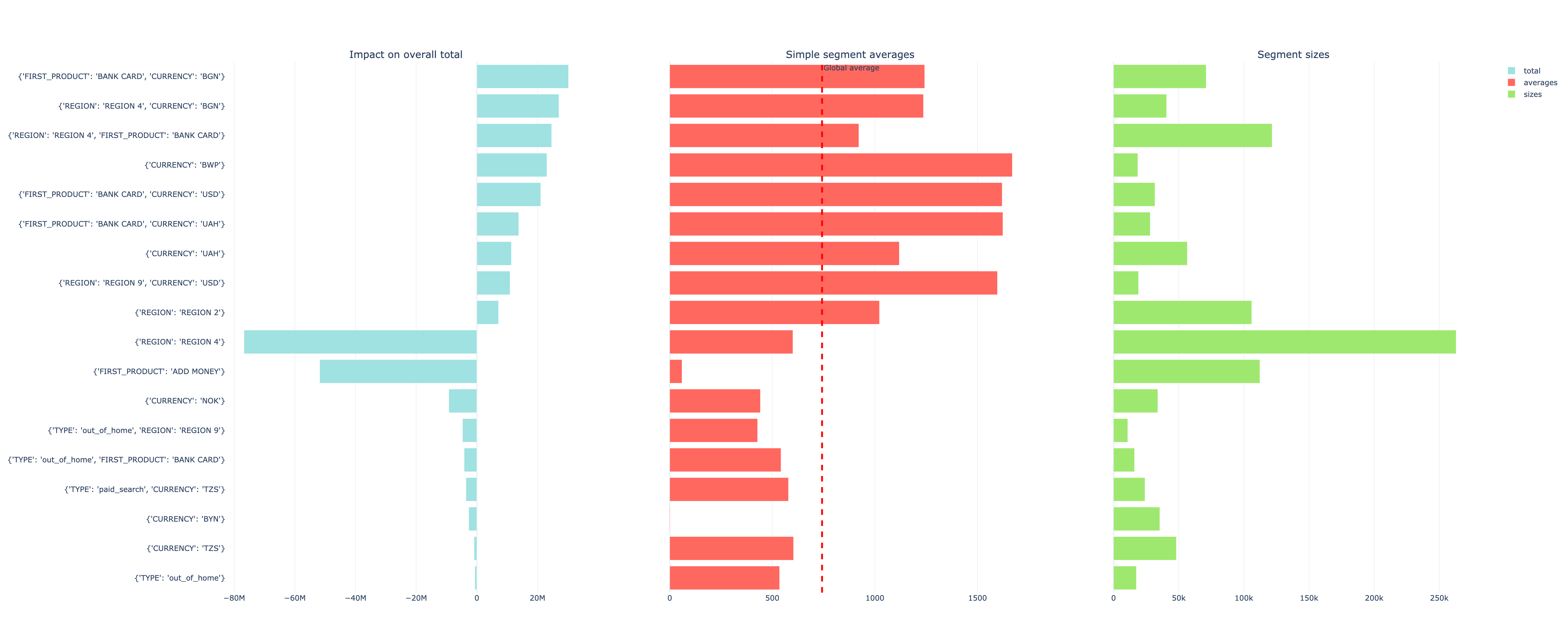 explain_levels takes such a dataset and looks for a small number of 'simple' segments (each only constraining a small number of dimensions) that between them explain most of the variation in the averages; you could also think of them as the segments whose size-weighted deviation from the overall dataset average is the largest. This trades off unusual averages (which will naturally occur more for smaller segments) against segment size.