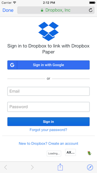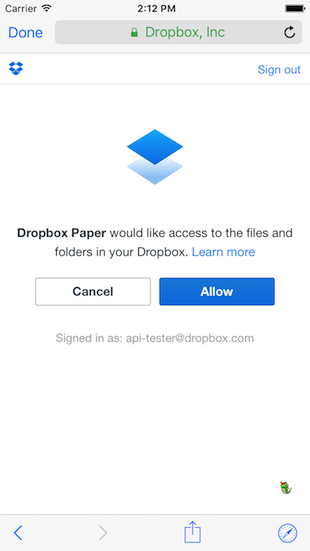 • Safari view controller auth (iOS only): This launches a SFSafariViewController to facillitate the auth flow. This is desirable because it is safer for the end-user, and pre-existing session data can be used to avoid requiring the user to re-enter their Dropbox credentials.