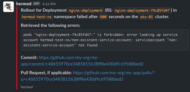 Any errors during the deployment rollout are captured and included in the Slack message (see example below). This can be very useful to help quickly debug a failing deployment.