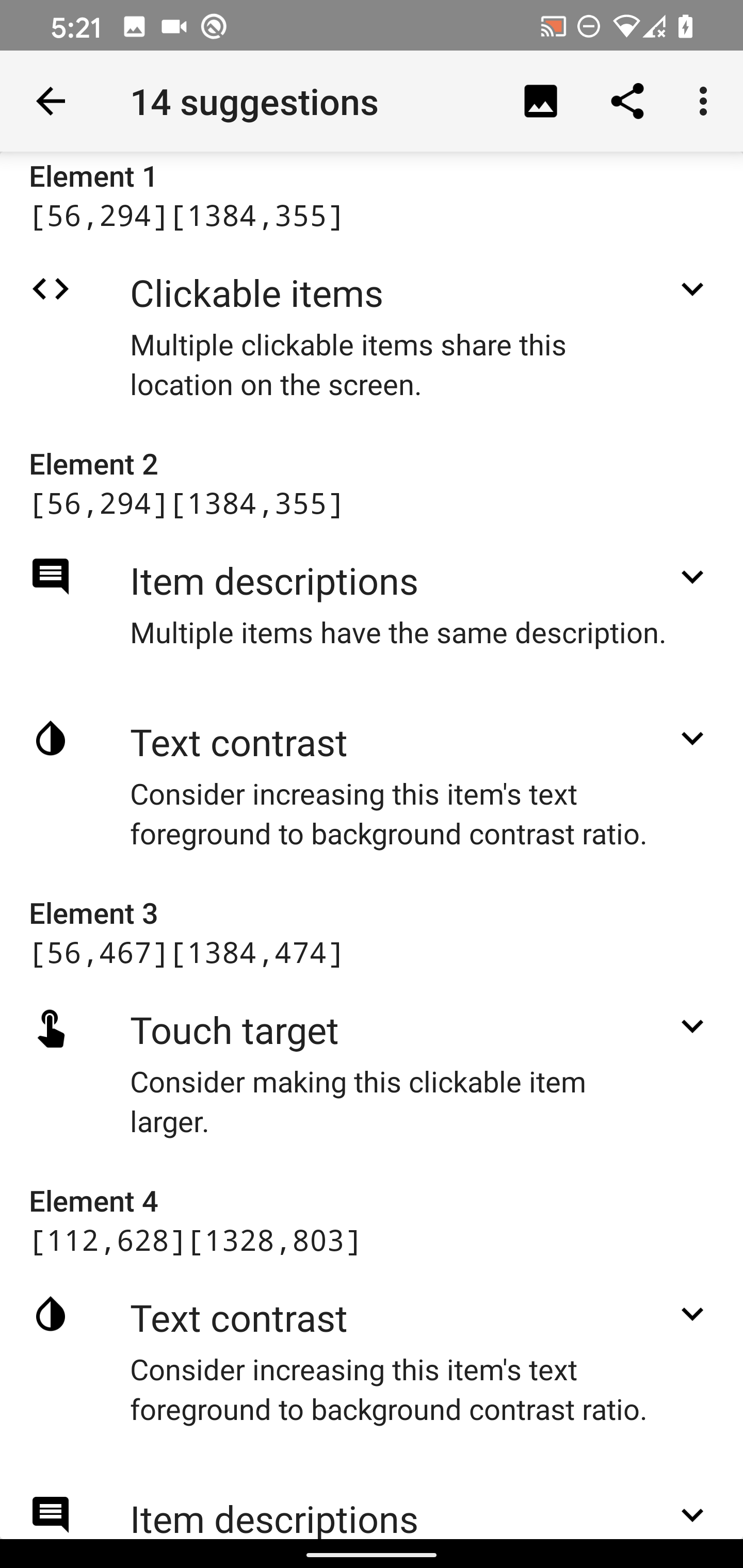 Most notably, there were issues with components not meeting touch target recommendations, text contrast & missing labels. Based on my experience with the results of this scan there will be some issues that can be ignored due to design & usability reasons but for others can be addressed