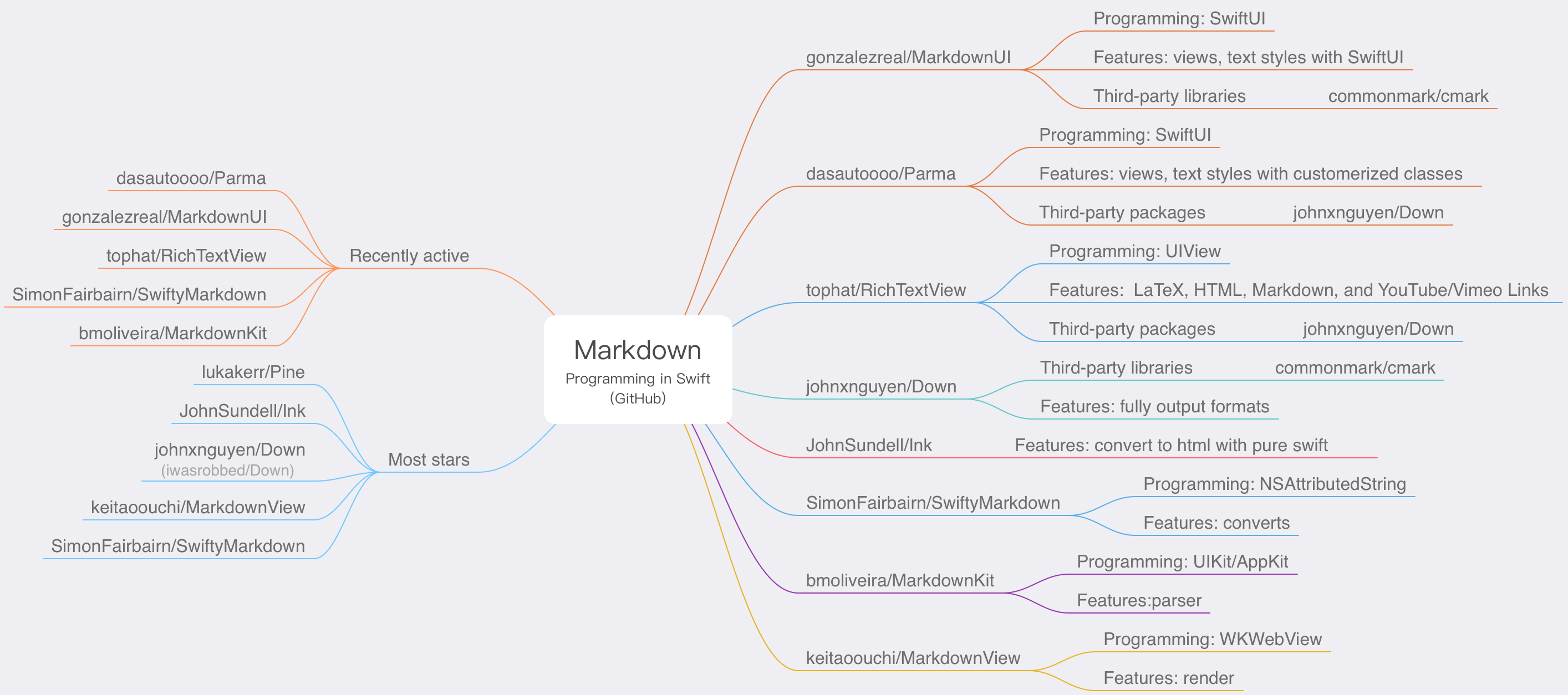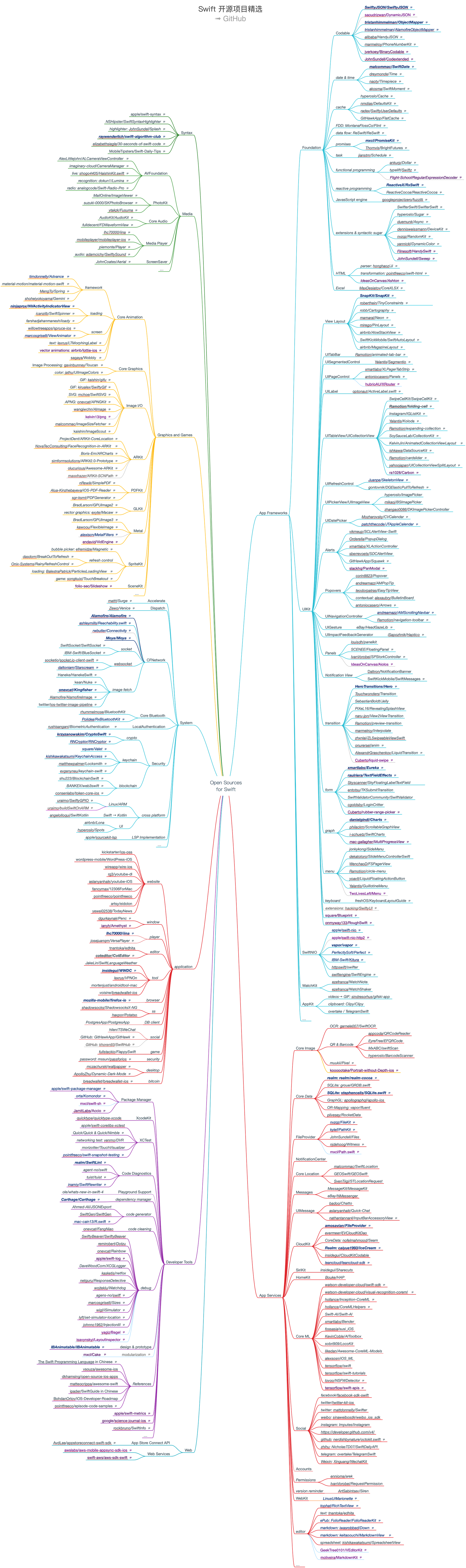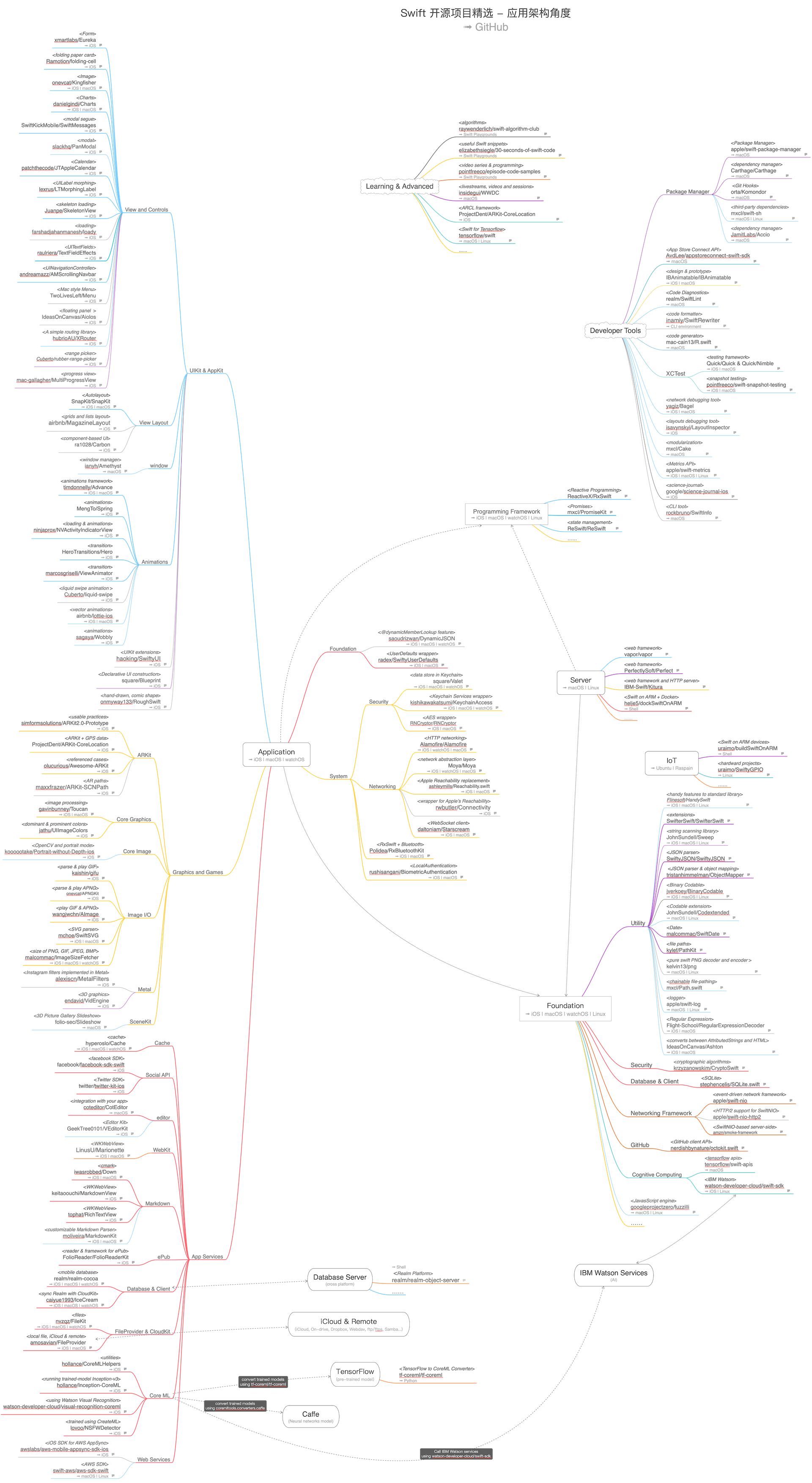 这份文档主要基于微博 @SwiftLanguage 跟踪过活跃于 Swift 语言领域的那些 GitHub 开源项目,顺便也是对于过去几年关注的开源项目进行一次系统化梳理。尝试整理出一份相对结构化且精练的 Swift 开源项目参考知识库,它将主要以思维导图形式呈现。详见……